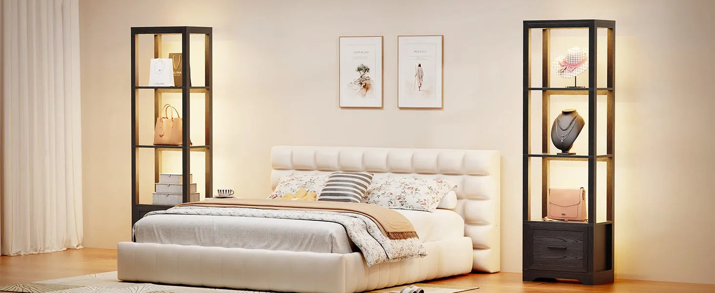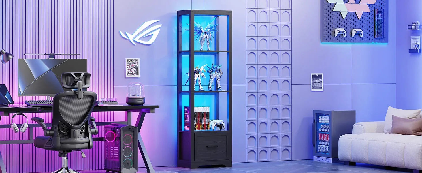 A compact LED-lit display shelf with a drawer — perfect for books, trophies, and essentials.