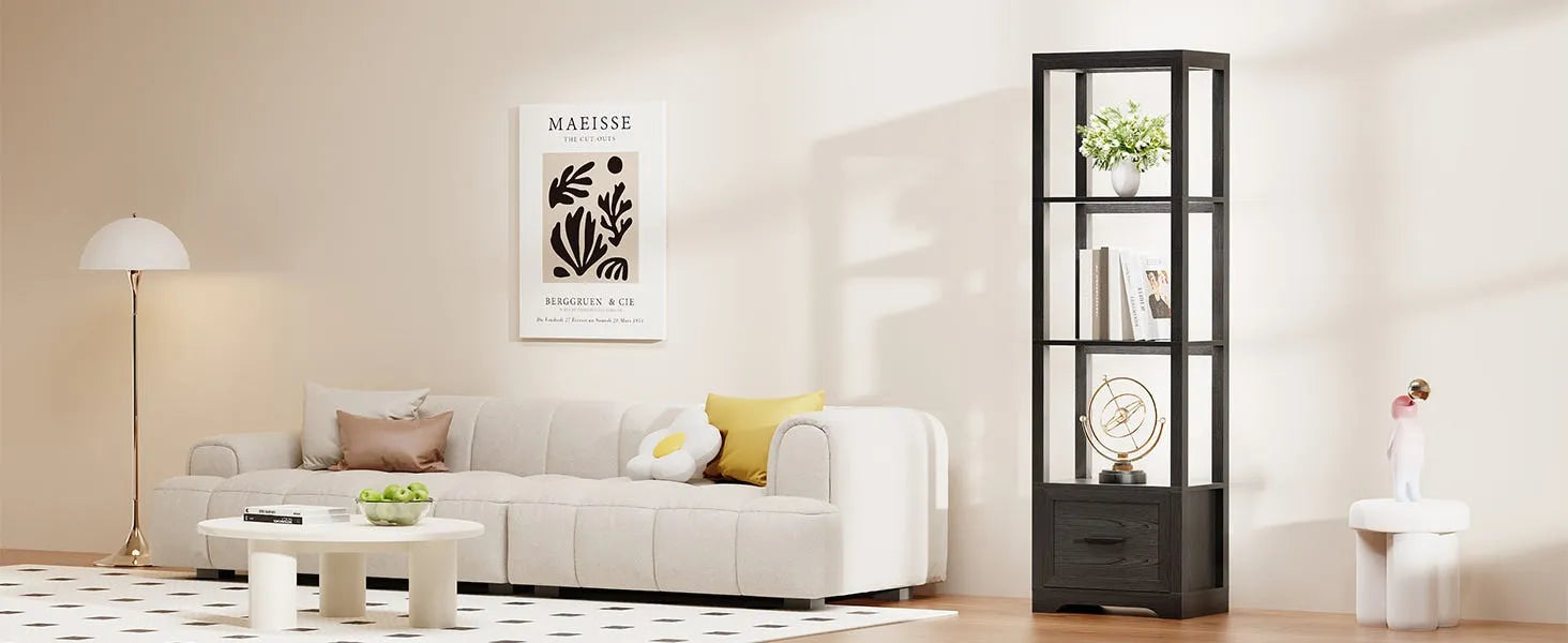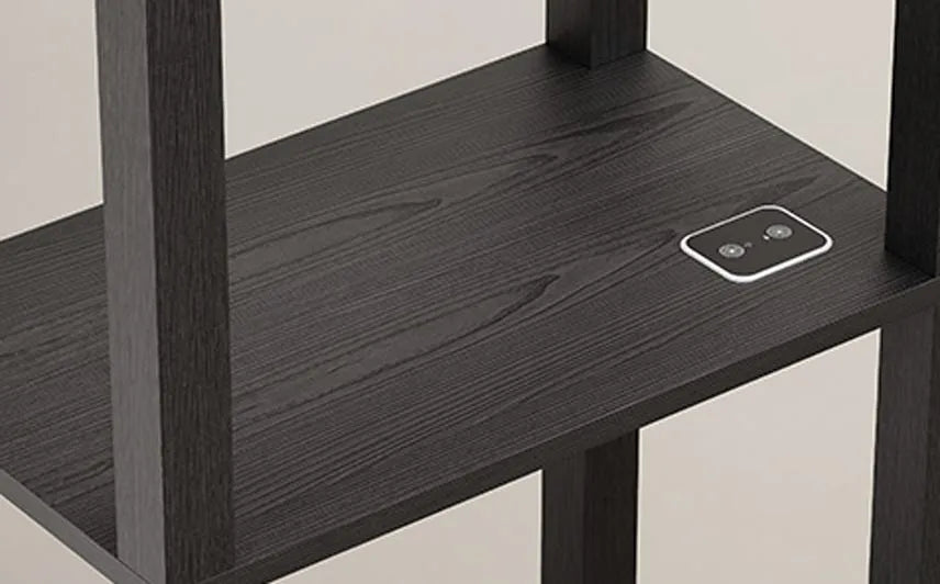 Modern LED bookshelf with motion sensor and hidden drawer. Stylish and functional for apartments.