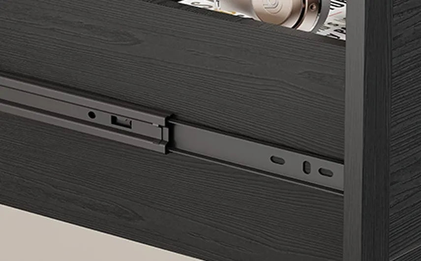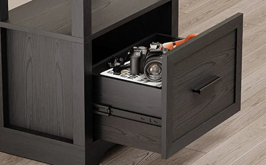 - Bottom drawer with smooth rails keeps essentials hidden.