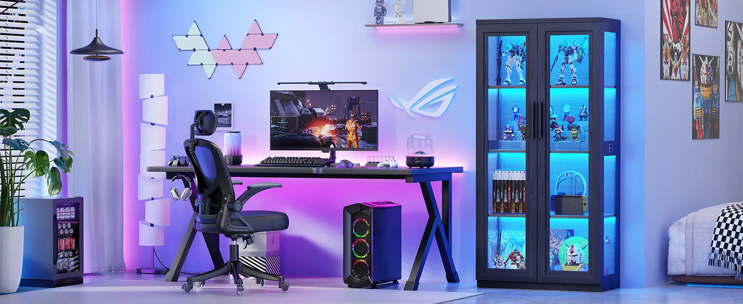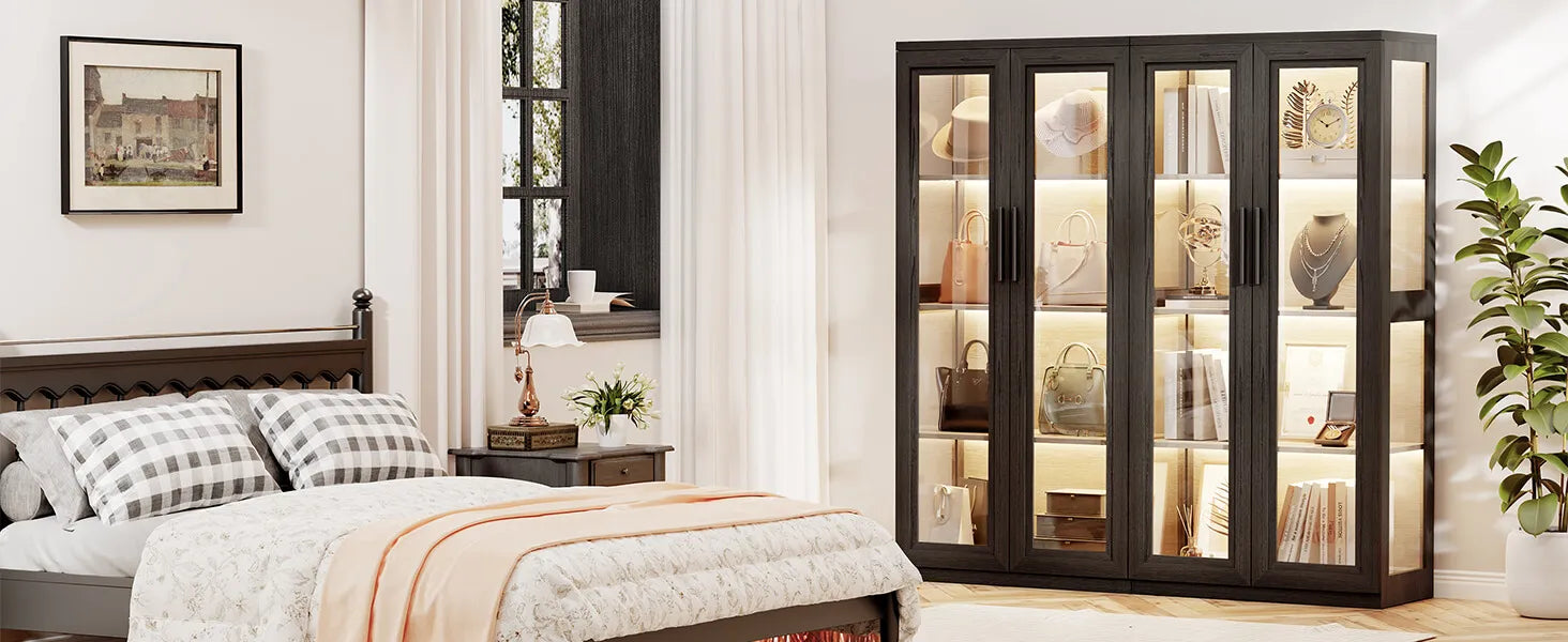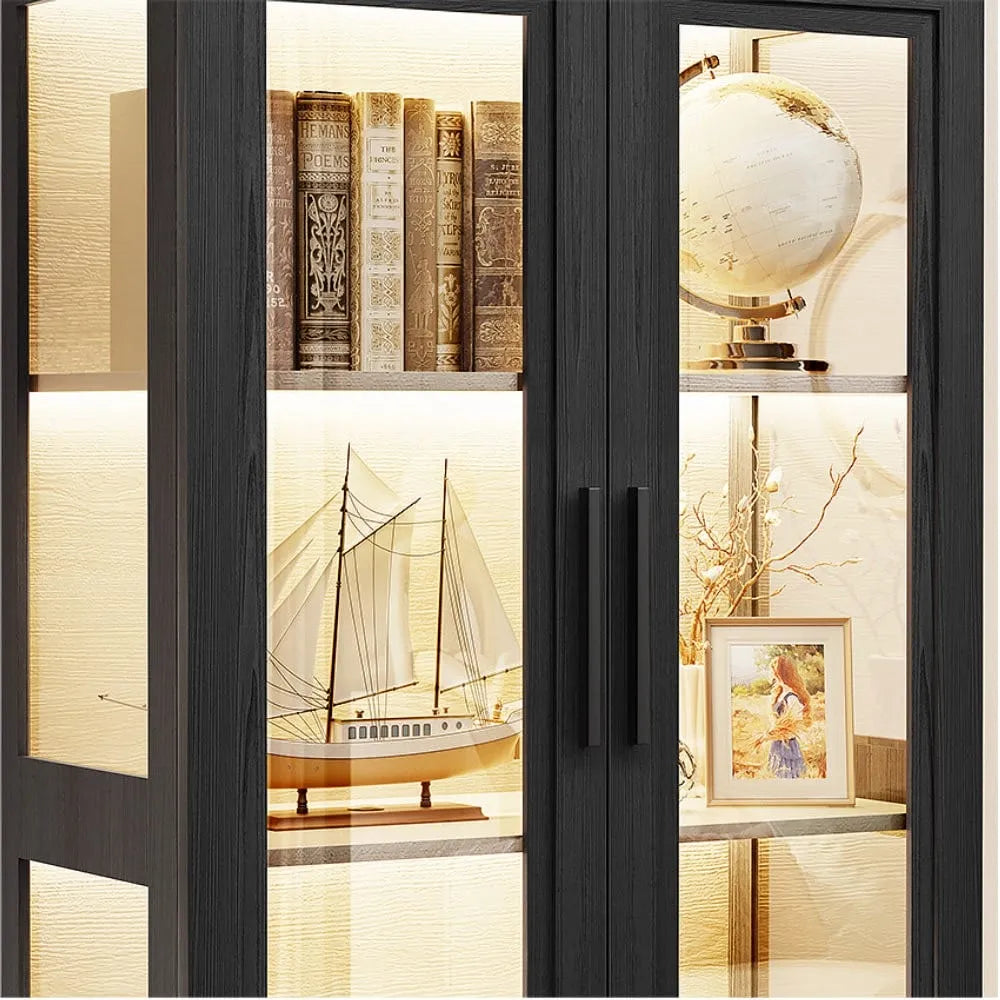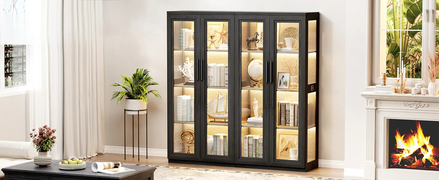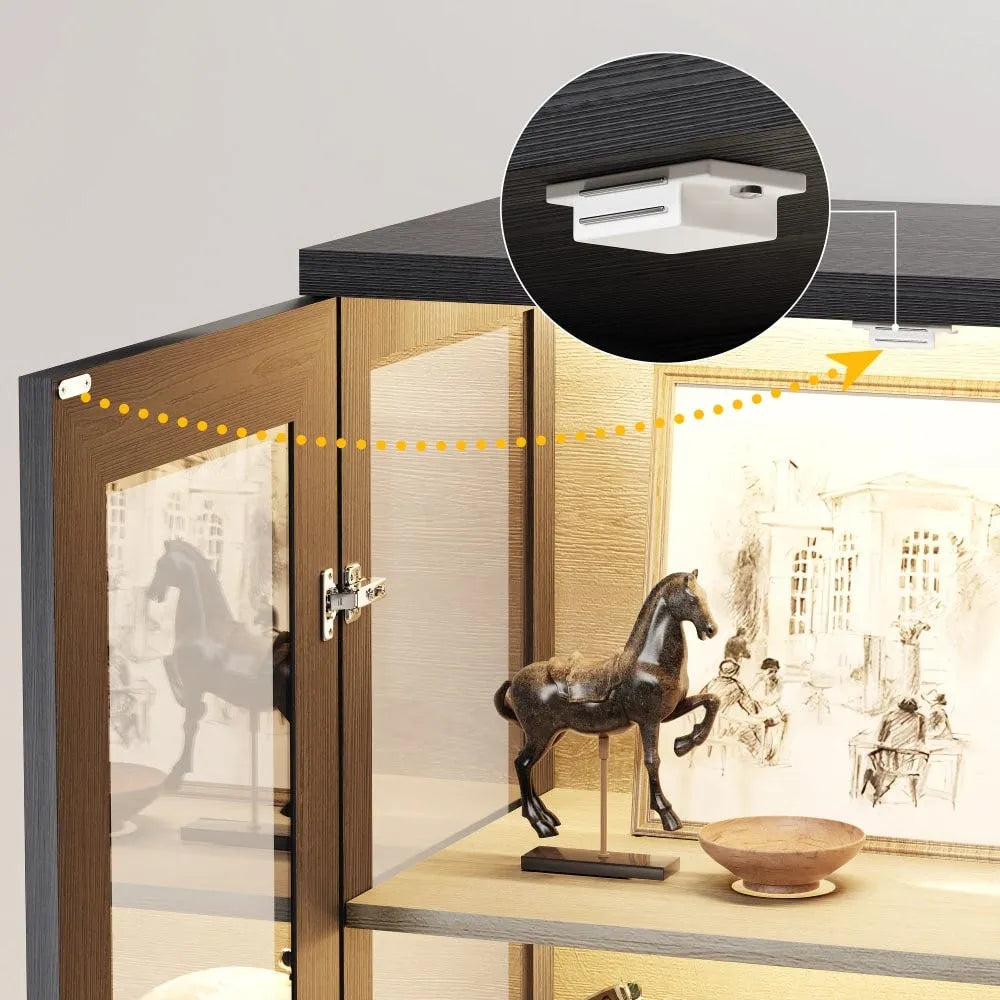 A modern black curio cabinet with tempered glass doors, sensor LEDs, and buffer hinges. Elegant storage with secure magnetic lock.