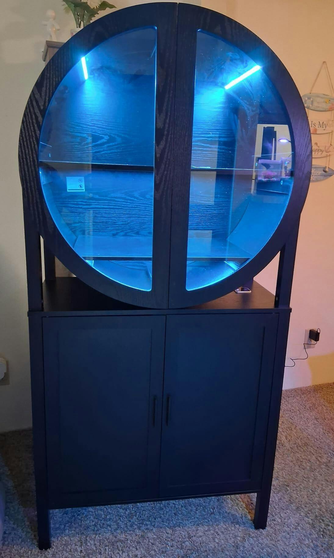 A curved LED bar cabinet designed for the modern host — elegance, storage, and lighting in perfect harmony.